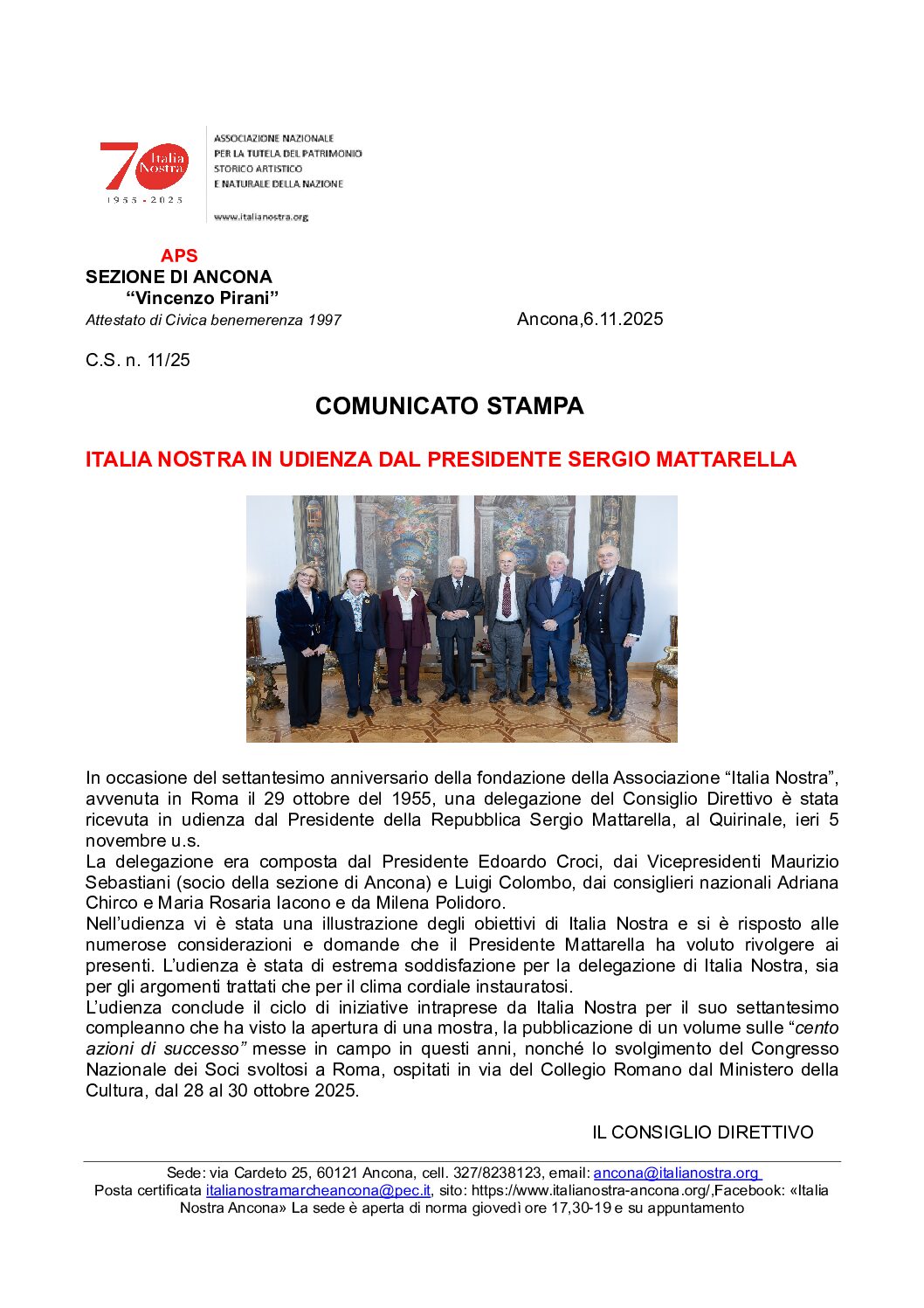 COMUNICATO STAMPA n. 11.25: ITALIA NOSTRA IN UDIENZA DAL PRESIDENTE SERGIO MATTARELLA.
